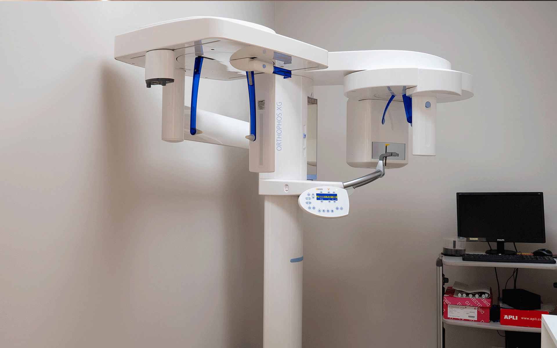 Para llevar a cabo la ortopantomografía, el paciente debe colocarse frente a un equipo de radiografía panorámica.